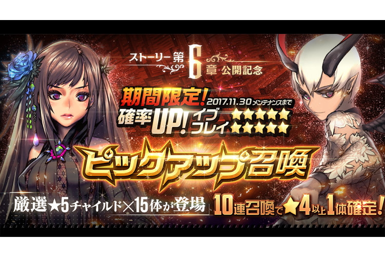 ゲーム情報 2017年11月24日 6章開放記念ピックアップ召喚開催!! 11月24日~30日メンテナンスまでの期間限定で『6章開放記念ピックアップ召喚』を開催!!開催期間:正式サービス開始から2017年11月30日メンテナンスまで 概要:ストーリー第6章公開を記念して、ストーリーの中核を担う★5イブ、★5フレイがピックアップ召喚にて確率アップで登