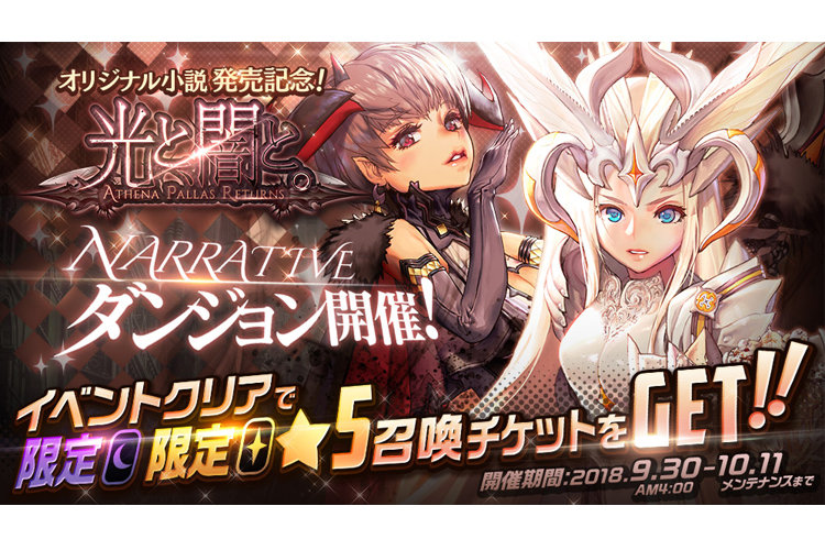 ゲーム情報 アップデート/メンテナンス 2018年09月30日 アテナ・パラス登場!オリジナル小説発売記念!!NARRATIVEダンジョン「光と、闇と。」開催! 祝!デスティニーチャイルド初のオリジナル小説発売記念!!オリジナル小説登場のアテナ・パラスのもう一つの物語をNARRATIVEダンジョンで堪能しよう。9月30日(日)より、NARRATIVEダンジョン『光と、闇と。』開催!9月29日(土)に発売された、オリジナル小説「デスティニーチャ