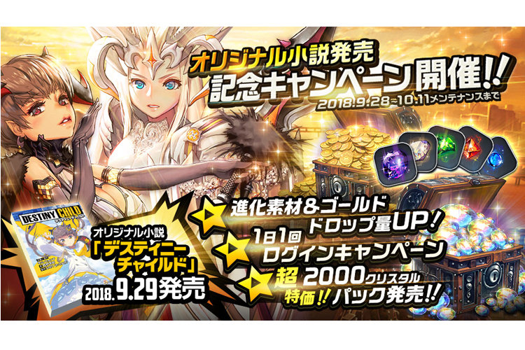 ゲーム情報 アップデート/メンテナンス 2018年09月28日 オリジナル小説発売記念キャンペーン開催!! デスティニーチャイルド初のオリジナル小説が9/29(土)発売!!これを記念して、オリジナル小説発売記念キャンペーン開催いたします!!「デスチャ」をもっと楽しんでいただけるような、ビッグなキャンペーンをご用意いたしました!【イベント一覧】①進化素材&ゴールドダンジョ