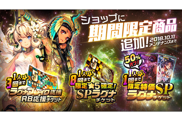 ゲーム情報 アップデート/メンテナンス 2018年09月21日 [9/20]ショップに期間限定商品が登場!※9/21更新 「限定特価SPラグナチケット」や、「RB応援チケット」などがショップに登場!「限定★5確定SPラグナチケット」からは、新登場の★5ソウルカルタ「禁断の果実」か「7回目の家出」のどちらか1枚が手に入ります。また、「限定特価SPラグナチケット」は1人1回限りで通常¥4000の