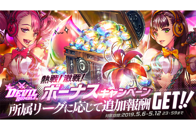 ゲーム情報 アップデート/メンテナンス 2019年05月03日 デビルランブル強化週間★熱戦!激戦!!ボーナスキャンペーン PvPコンテンツ「デビルランブル」強化週間!5月12日(日)23:59の最終所属リーグに応じた追加報酬をプレゼント!皆さんの参戦をお待ちしています!!2019年5月6日(月)AM4:00~5月12日(日)23:59まで毎週熱戦!激戦!!が繰り広げられているデビルランブルにおいて、獲得報酬のボリュ
