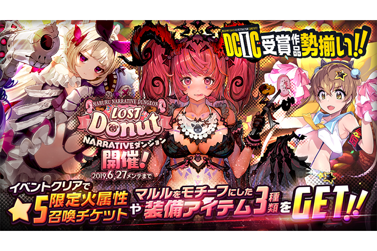 ゲーム情報 アップデート/メンテナンス 2019年06月13日 DCIC受賞作品勢揃い★NARRATIVEダンジョン「LOST Donut」開催! 盗まれてしまった、マルルの大切なドーナツを取り返すことが出来るのか!?6月13日(木)メンテナンス後より、『DCIC-デスティニーチャイルドイラストコンテスト-』受賞作品が勢揃いした、マルルのNARRATIVEダンジョン「LOST Donut」開催!2019年6月13日(木)メンテナンス後~6