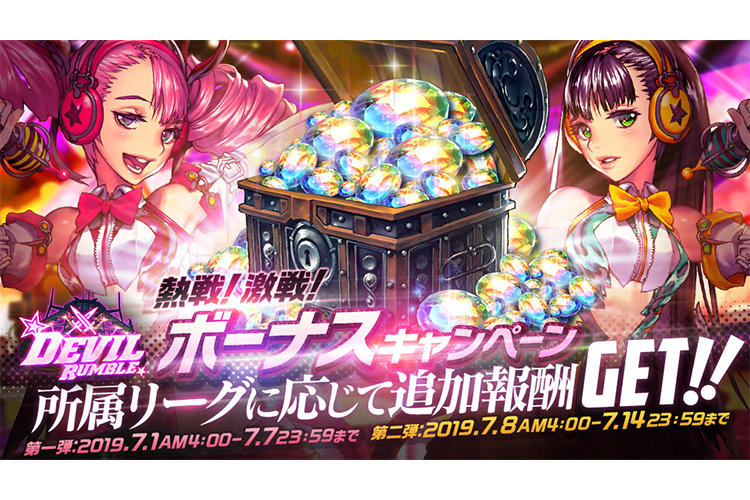 ゲーム情報 アップデート/メンテナンス 2019年06月28日 デビルランブル強化週間★熱戦!激戦!!ボーナスキャンペーン PvPコンテンツ「デビルランブル」強化週間が2週に渡って登場!!7月7日(日)23:59までと、7月14日(日)23:59までの最終所属リーグに応じた追加報酬をプレゼント!皆さんの参戦をお待ちしています!!▶第1弾開催期間2019年7月1日(月)AM4:00~7月7日(日)23:59まで▶第2弾開催期間2