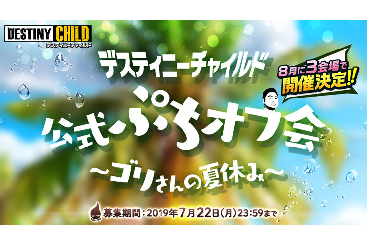 お知らせ ゲーム情報 2019年07月22日 【本日締切!】東京・大阪・福岡の3会場で開催!『デスティニーチャイルド公式ぷちオフ会~ゴリさんの夏休み~』が開催決定!! 2019年夏、デスチャ運営のゴリさんが魔王候補生の皆さんに会いに行きます!!東京、大阪、福岡の3会場で、『デスティニーチャイルド公式ぷちオフ会~ゴリさんの夏休み~』が開催決定!!本日から各会場の参加受付を開始!皆さまからのご応募をお待ちしております♪--------------