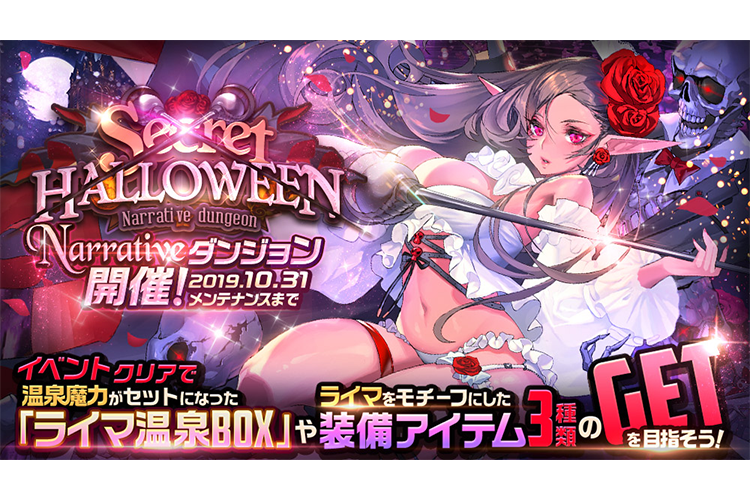 ゲーム情報 アップデート/メンテナンス 2019年10月17日 NARRATIVEダンジョン《Secret HALLOWEEN》開催! 謎の悪魔ライマの《秘密》とは…10月17日(木)メンテナンス後より、ライマNARRATIVEダンジョン『Secret HALLOWEEN』を開催します!▶開催期間2019年10月17日(木)メンテナンス後~10月31日(木)メンテナンスまで新登場チャイルド 「ライマ」(CV:又吉愛)をフィーチャーしたスト