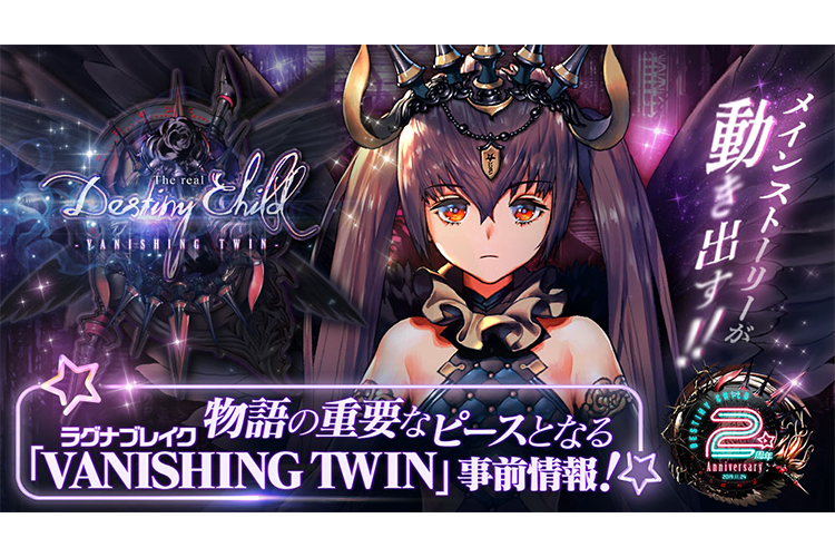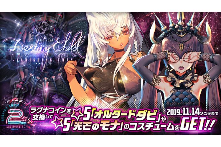 ゲーム情報 アップデート/メンテナンス 2019年10月24日 転機となる物語ーラグナブレイク『VANISHING TWIN』事前情報公開!! 2019年11月24日(日)に『デスティニーチャイルド』はサービス2周年を迎えることになりました。これもいつも遊んでいただいている、魔王候補生皆様のおかげです。誠にありがとうございます!そして、2周年を記念したイベントが10月31日(木)メンテナンス後からスタートします!