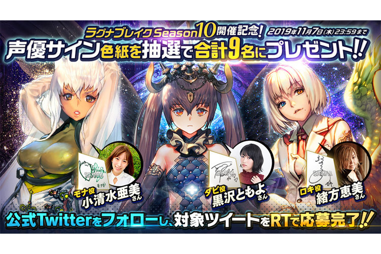 お知らせ ゲーム情報 2019年10月31日 ラグナブレイク Season10開催記念!公式Twitterフォロー&RTで声優サイン色紙プレゼント!! 「ラグナブレイク Season10 -VANISHING TWIN-」の開催を記念し、キャラクターのボイスを担当する3名の声優さんの直筆サイン色紙を合計9名の方にプレゼント!!応募方法は簡単!「公式Twitter(@destinyc_info)をフォロー」し、「対象ツイートをRT(リツイート)」の2STEPで簡単に