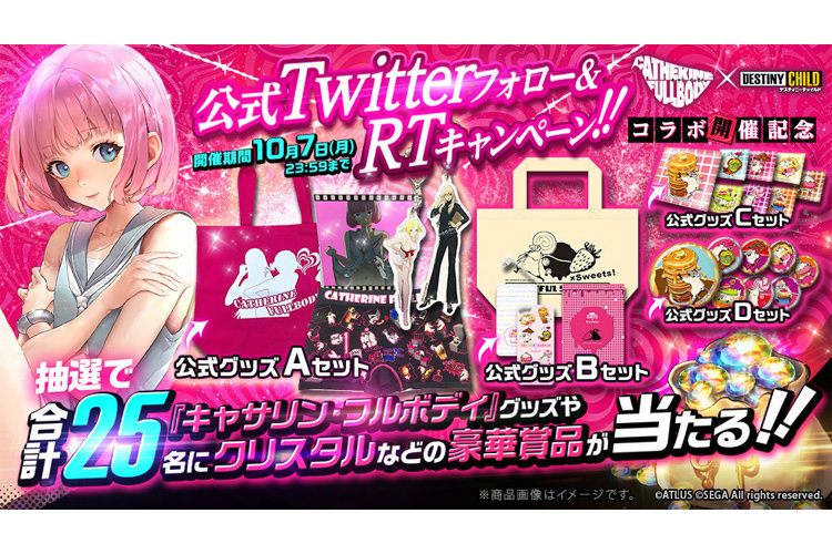 お知らせ ゲーム情報 2019年10月07日 【本日終了!】『キャサリン・フルボディ』コラボ開催記念!公式Twitterフォロー&RTキャンペーン!! 『キャサリン・フルボディ』とのコラボ開催を記念し、公式Twitterフォロー&RT(リツイート)キャンペーンを開催!!抽選で「キャサリン・フルボディ公式グッズ」や「クリスタル」を合計25名にプレゼント!!応募方法は簡単!「公式Twitter(@destinyc_info)をフォロー」し、「対象