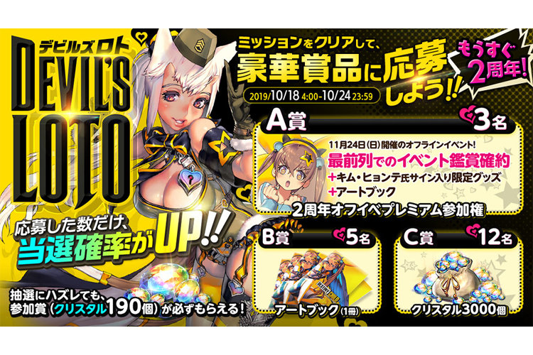 お知らせ ゲーム情報 2019年10月18日 ミッションをクリアして、豪華賞品に応募しよう!『DEVIL’S LOTO-デビルズ ロト-』開催!! ゲーム内のミッションをクリアして応募券を集め、「2周年オフイベプレミアム参加権」や「クリスタル」などの豪華賞品に応募しよう!応募した数だけ、当選確率がUP!!抽選にハズレても参加賞として「クリスタル190個」が必ずもらえる!皆さん、ぜひご参加くださいね♪---------