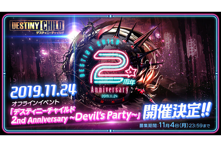 お知らせ ゲーム情報 2019年10月25日 【10/25追記】オフラインイベント「デスティニーチャイルド 2nd Anniversary 〜Devil's Party〜」開催決定! 【10/25追記】2019年11月24日(日)に開催される「デスティニーチャイルド 2nd Anniversary 〜Devil's Party〜」に、モナ役の「小清水亜美」さんと、レダ役の「伊月ゆい」さんの出演が決定!!【追加出演者】・小清水亜美さん(モナ役)・伊月ゆいさん(レダ役)あわせて、イベントの