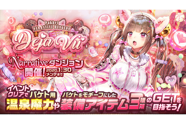 ゲーム情報 アップデート/メンテナンス 2020年01月14日 パケトNARRATIVEダンジョン《Deja Vu》開催! かわいいパケトの手作りチョコですよ~!1月14日(火)メンテナンス後より、パケトNARRATIVE(ナラティブ)ダンジョン『Deja Vu』を開催します!新登場チャイルド「パケト」(CV:武石あゆ実)をフィーチャーしたストーリーが楽しめる、パケトNARRATIVEダンジョン「Deja Vu」が開催