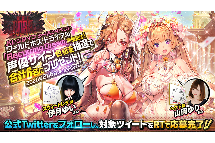 お知らせ ゲーム情報 2020年01月30日 ワールドボス・トライアル《ヘケト》開催記念!公式Twitterフォロー&RTで声優サイン色紙プレゼント!! バレンタインシーズンイベント開幕!ワールドボス・トライアル《ヘケト》の開催を記念し、新★5チャイルド「ヘケト」と「スウィートレダ」のボイスを担当する山岡ゆりさんと伊月ゆいさんの直筆サイン色紙を合計6名の方にプレゼント!!応募方法は簡単!「公式Twitter(@destinyc