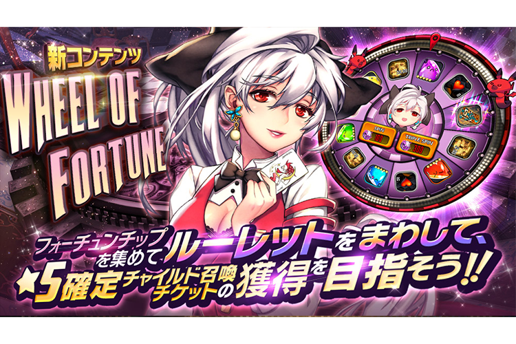ゲーム情報 アップデート/メンテナンス 2020年01月14日 新コンテンツ「WHEEL OF FORTUNE」開催! ▶《WHEEL OF FORTUNE》とは?ルーレットを回すために必要な「フォーチュンチップ」を集めることで、ルーレットにチャレンジして、当たった盤面に描かれている報酬がGETできるイベントです。・参加方法▶ホーム画面に「WHEEL OF FORTUNE」のアイコンが表示されているので、ア