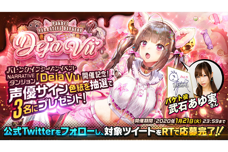 お知らせ ゲーム情報 2020年01月14日 NARRATIVEダンジョン《Deja Vu》開催記念!公式Twitterフォロー&RTで声優サイン色紙プレゼント!! バレンタインシーズンイベント開幕!NARRATIVEダンジョン《Deja Vu》の開催を記念し、新★5チャイルド「パケト」のボイスを担当する武石あゆ実さんの直筆サイン色紙を3名の方にプレゼント!!応募方法は簡単!「公式Twitter(@destinyc_info)をフォロー」し、「対象ツイートをRT