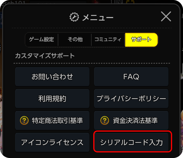 ホーム画面右上「MENU」→「サポート」→「シリアルコード入力」へコードにメールに添付されたシリアルコードを入力します。